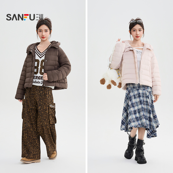 三福泡芙羽绒服2025新款冬季加厚保暖连帽宽松粉色外套女装850097