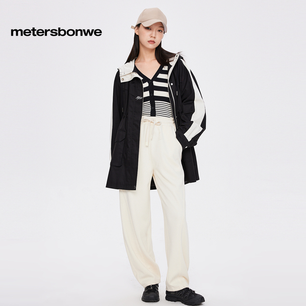 美特斯邦威百搭夹克女潮流拼色休闲连帽宽松舒适风衣上衣中长款