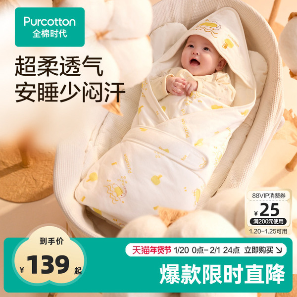 原价139-券60-立减17.88-官方补贴5-下拉领淘金币10.66-淘礼金2.22=61.1,凑200-25券。到手价54起!!全棉时代新生婴儿包被秋冬宝宝产房初生抱被四季通用包单【TK】