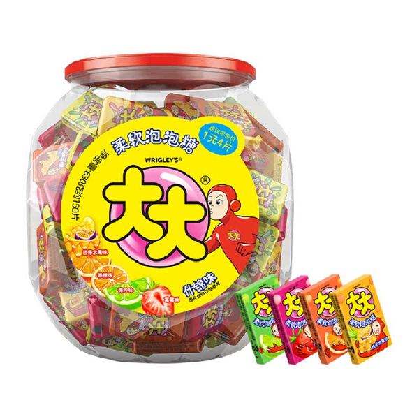 大大柔软泡泡糖,换新登场,4种趣味包装,热带水果味,香橙味,青柠味,草莓味。
