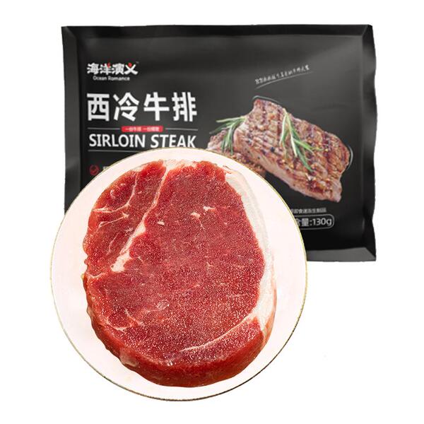 【海洋演义】整切西冷牛排,略带肥边,囗感柔韧、汁水充盈。肉质醇香、鲜嫩可口。选自牛后腰脊部位,口感韧劲十足。源自天然牧场、日照充足、水草丰美,精心人工饲养孕育好牛。锁住新鲜距离不是问题,全程冷藏保温新鲜到家。